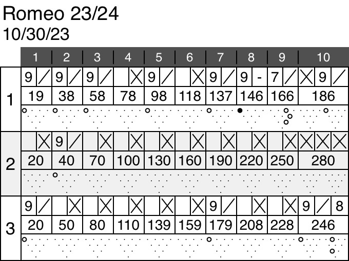 Here again, there are no actual notes, which is sweet, but to explain why the only moves that happened were after seven pins, and that was moving back right cause the lane finally opened up where I was able to play the lane a little bit more and have some area for error. Now, going 280,290 would have been sweet because I did only do that once unless you count Wii Bowling. But having a chance for 269 would have been just as sweet. But, like getting a pack of raisins in your bag on Halloween, a seven-pin had to make one more appearance to spoil that.