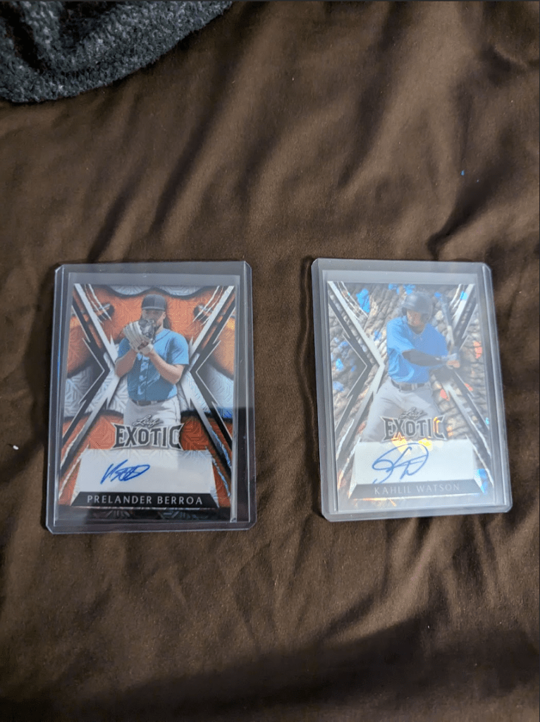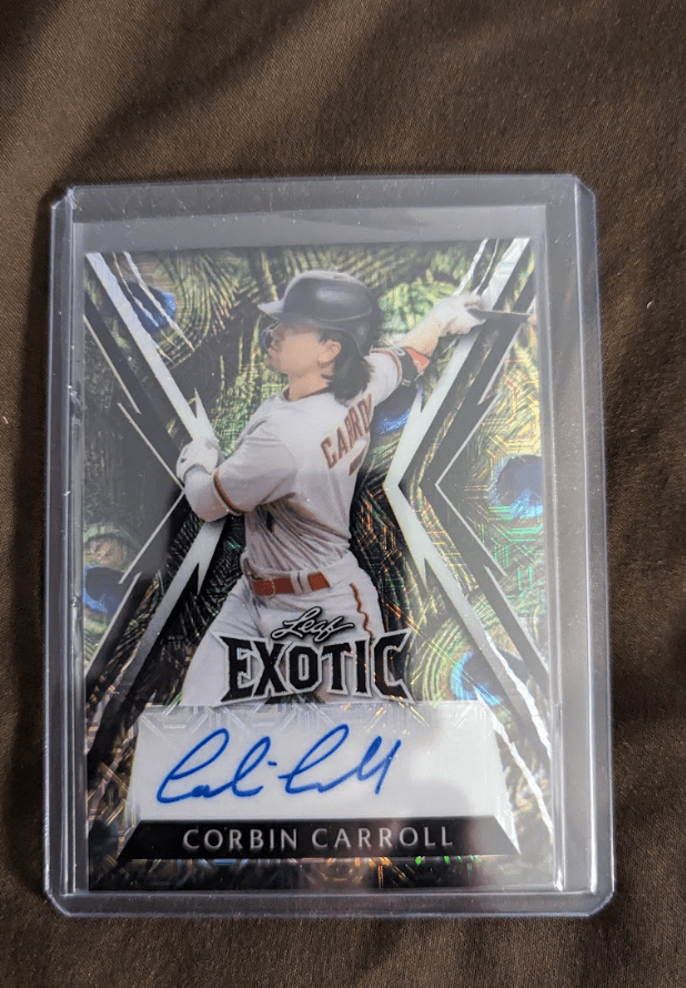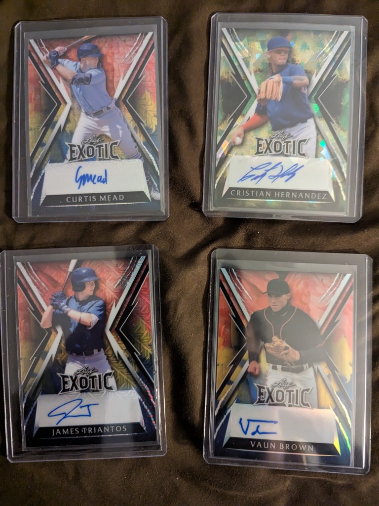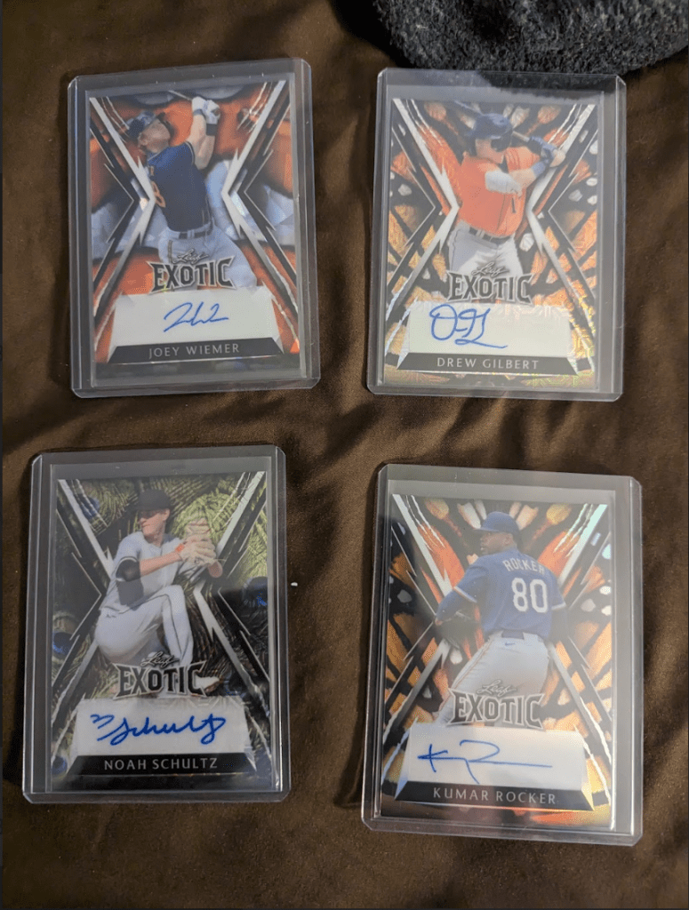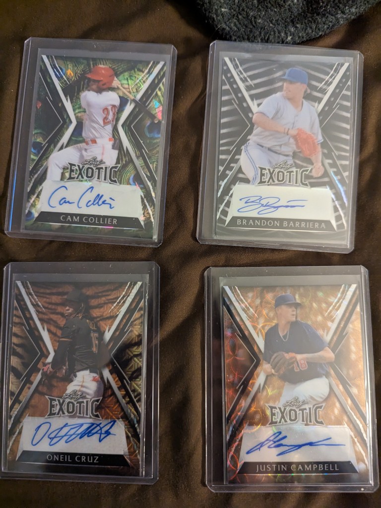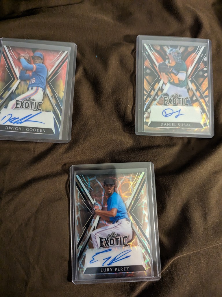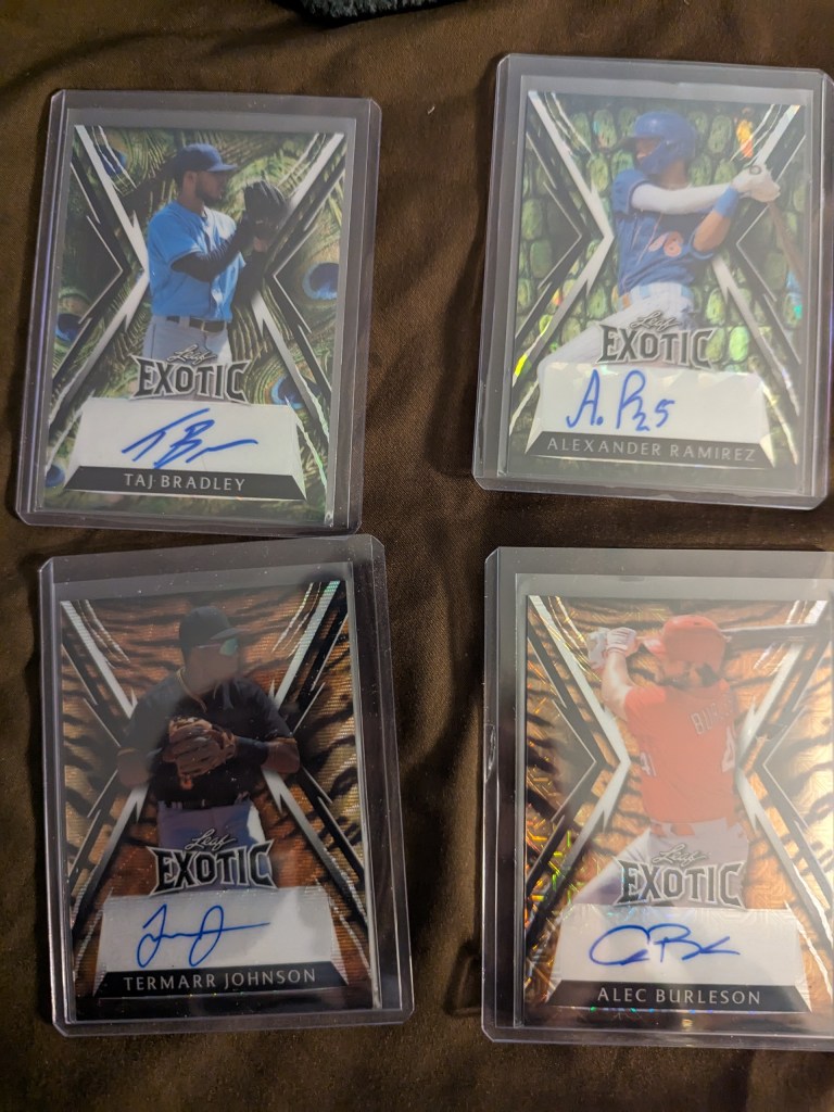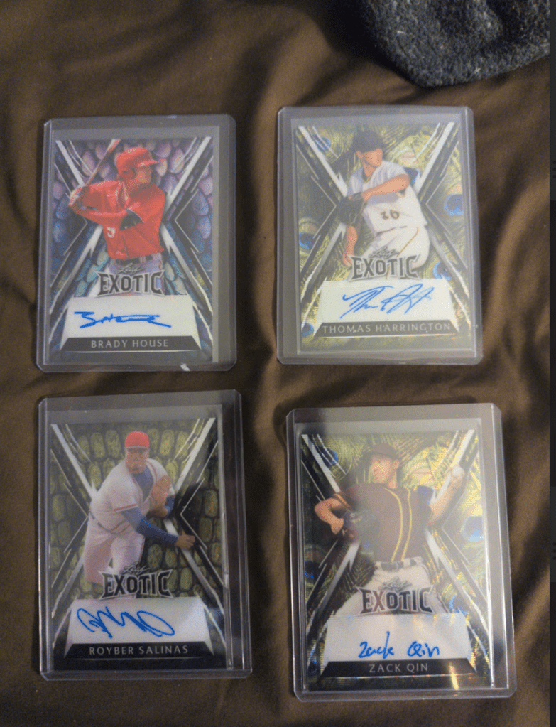 So Leaf Exotic is a great way to get autographs and not just common and uncommon, with a few rare ones thrown in. No, you get three current, HOF, or rookie auto per box numbered ten or less, so you got a good chance per box to get someone who is known or very well known and reasonable price for three autographs.